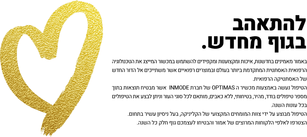 הטיפול נעשה באמצעות מכשיר ה OPTIMAS של חברת INMODE אשר מבטיח תוצאות בתוך מספר טיפולים בודד, מהיר, בטיחותי, ללא כאבים, מותאם לכל סוגי העור וניתן לבצע את הטיפולים בכל עונות השנה.